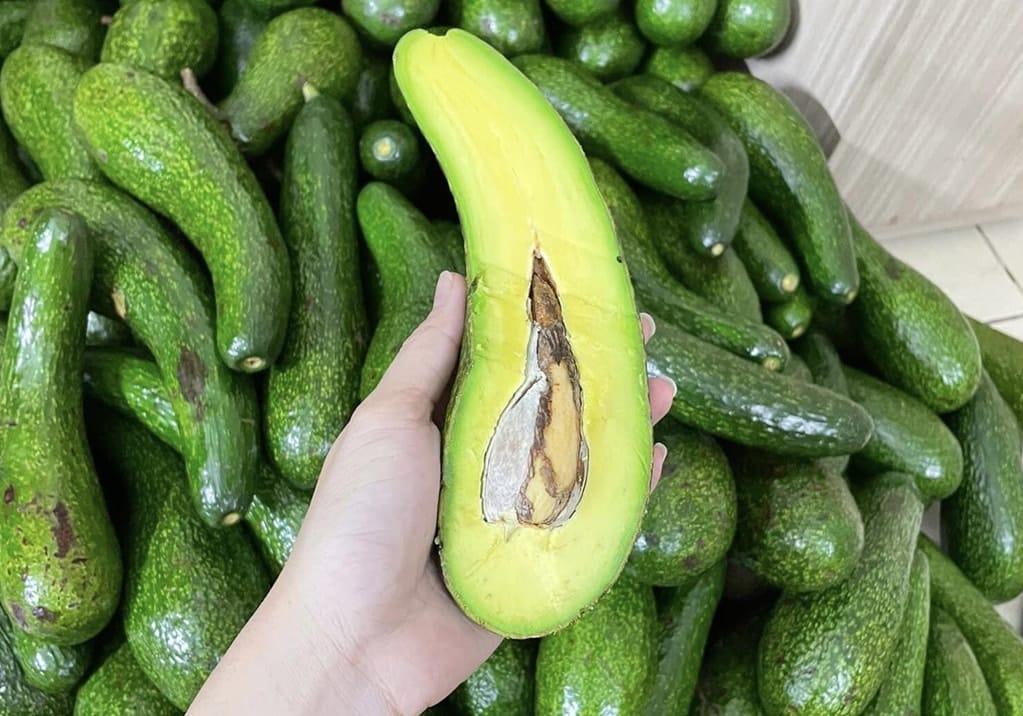 - Bơ 034: Đây được xem là "niềm tự hào" của ngành bơ Lâm Đồng và là một trong những giống bơ thành công nhất tại Việt Nam hiện nay. Giống bơ này có nguồn gốc từ một cây bơ mọc tự nhiên trong vườn của ông Nguyễn Văn Dậu tại Lâm Đồng và sau đó được nhân giống rộng rãi. Bơ 034 thuộc nhóm hoa B , nổi bật với hình dáng quả thon dài đặc trưng, có thể dài từ 20-38 cm. Vỏ quả mỏng, màu xanh bóng đẹp mắt. Ưu điểm vượt trội của giống này là hạt rất nhỏ, lép hoặc thậm chí không có hạt, giúp tỷ lệ thịt quả đạt mức rất cao, 75-85%. Thịt quả có màu vàng tươi, kết cấu sáp dẻo, độ béo cao và hương vị thơm ngon. Cây bơ 034 sinh trưởng khỏe, cho quả sớm và có năng suất ổn định, đặc biệt có khả năng ra quả trái vụ, giúp nông dân thu được lợi nhuận cao.
