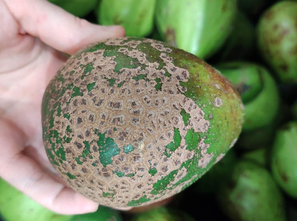 Bệnh ghẻ quả (Sphaceloma perseae) phát triển và lây lan mạnh mẽ trong điều kiện ẩm ướt và mát mẻ. Vết bệnh bắt đầu là những đốm nhỏ, tròn, màu nâu sẫm hoặc đen, xuất hiện riêng lẻ trên vỏ quả non. Các đốm này lớn dần, liên kết lại với nhau tạo thành những mảng sần sùi, màu nâu xám, có dạng như vảy ốc hoặc lớp vảy ghẻ. Bề mặt của các mảng ghẻ thường bị nứt nẻ, tạo thành các đường không đều.