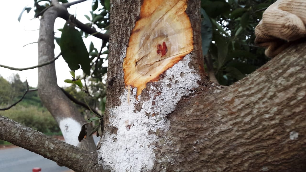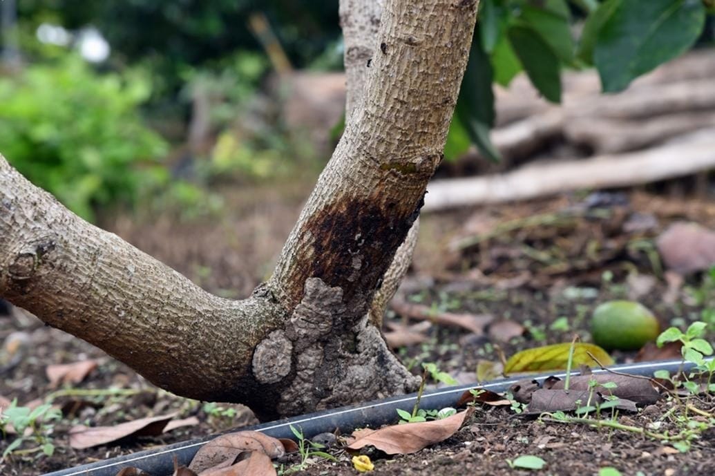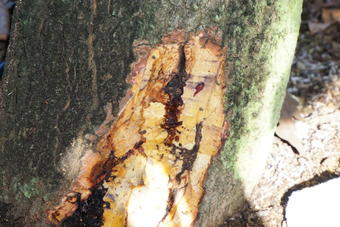 Bệnh nứt thân xì mủ (Phytophthora sp.) tấn công trực tiếp vào vỏ thân cây, đặc biệt là ở phần gốc gần mặt đất, gây ra các vết loét và chảy nhựa. Dấu hiệu đầu tiên và rõ ràng nhất là từ các kẽ nứt trên vỏ cây, một dòng nhựa màu nâu đỏ hoặc màu hổ phách chảy ra. Khi cạo lớp vỏ bị bệnh ra, phần mô gỗ và vỏ bên trong sẽ có màu nâu đen, hoại tử và có mùi hôi nhẹ.