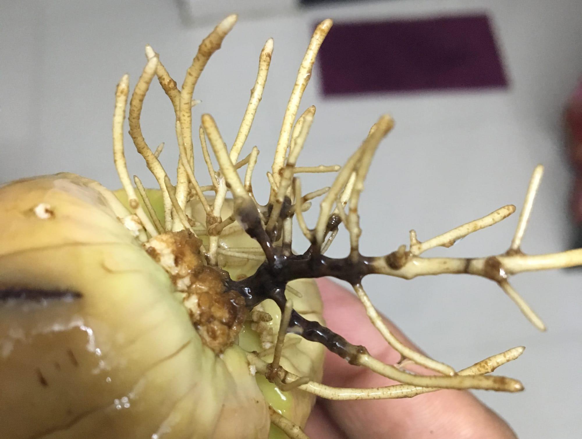 Bệnh thối cuống (Lasiodiplodia theobromae, Botryosphaeria rhodina) gây hại sau khi quả được hái và bắt đầu quá trình chín, hàm lượng các chất phòng vệ tự nhiên trong quả giảm xuống. Vết thối bắt đầu bằng một vùng sẫm màu xuất hiện ngay tại phần cuống quả. Phần thịt quả bị thối thường lan theo các bó mạch, tạo thành các tia hoặc một vùng thối rõ rệt.