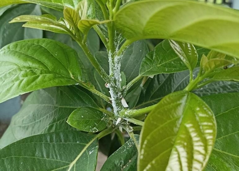 Rệp sáp (Pseudococcus spp.) tập trung ở mặt dưới lá, kẽ lá và các đọt non. Chúng chích hút làm cho chồi và lá non bị biến dạng, xoăn lại, vàng úa và dần khô héo. Lớp sáp trắng do rệp tạo ra cản trở quá trình quang hợp của lá. Chúng tấn công cuống hoa, cuống quả và phần vỏ quả non, làm quả còi cọc, biến dạng, vàng và rụng sớm. Rệp bám vào cuống và vỏ quả, làm giảm giá trị thương phẩm.