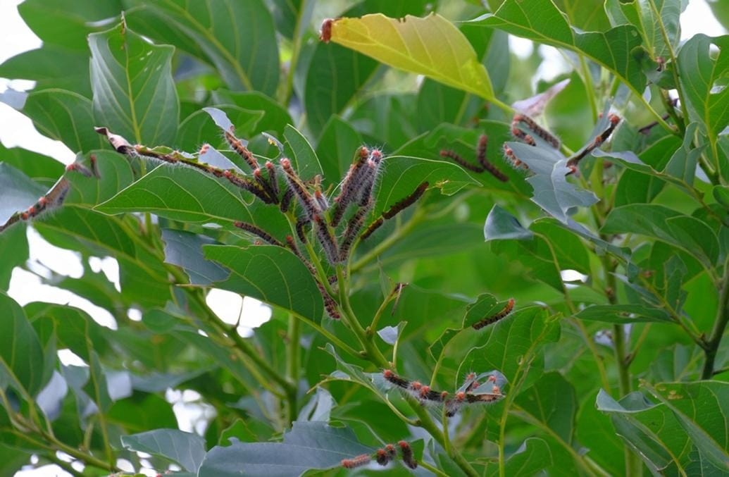 Sâu cuốn lá (Gracilaria percicae, Cricula trifenestrata) là bướm đêm rất nhỏ, có màu xám hoặc nâu nhạt. Chúng hoạt động chủ yếu vào ban đêm, bay đến các đọt lá non để đẻ trứng riêng lẻ trên bề mặt lá. Ấu trùng tấn công chủ yếu vào lá non, cuốn lá lại làm tổ hoặc ăn trụi phiến lá, làm giảm diện tích quang hợp, ảnh hưởng đến sự sinh trưởng của cây, đặc biệt là cây con.
