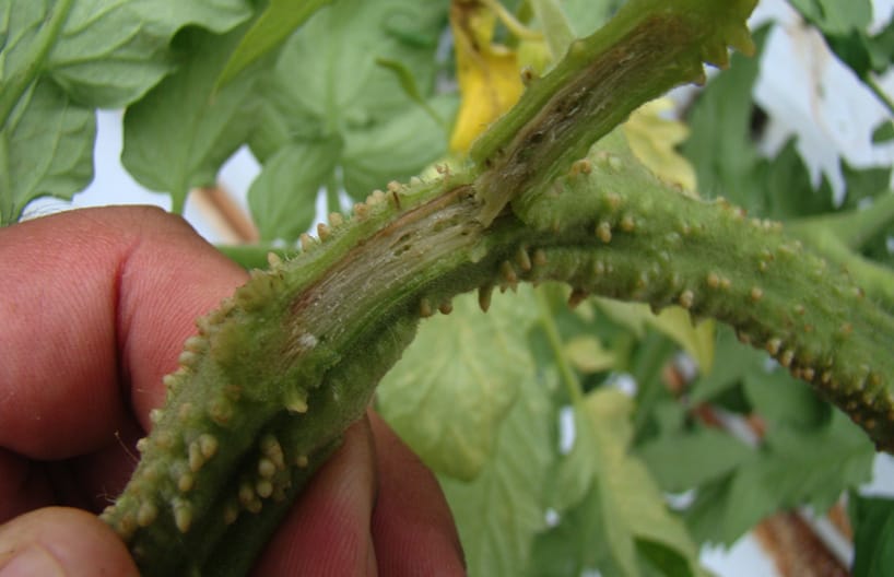 Tuyến trùng hại rễ (Meloidogyne sp.) chui vào chóp rễ non, bắt đầu chích hút dinh dưỡng và tiêm các độc tố vào tế bào rễ. Độc tố này kích thích các tế bào rễ phình to bất thường, tạo thành các tế bào khổng lồ và hình thành nên các nốt sưng (u, bướu). Các nốt sưng này chính là nguồn cung cấp dinh dưỡng cho tuyến trùng phát triển và sinh sản. Hệ thống rễ tơ bị phá hủy, giảm khả năng hút nước và dinh dưỡng.