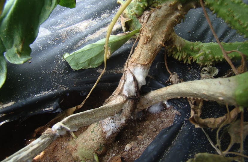 Bệnh héo rũ trắng gốc (Sclerotium rolfsii) phát triển trong điều kiện thời tiết nắng nóng và mưa nhiều xen kẽ. Cây đang sinh trưởng xanh tốt bỗng nhiên có biểu hiện héo rũ nhanh chóng trong khi các lá vẫn còn xanh. Quan sát kỹ phần thân cây sát mặt đất (cổ rễ), sẽ thấy vỏ thân bị úng nước, mềm nhũn và thối nâu. rong điều kiện thời tiết nóng ẩm, tại vị trí vết thối sẽ phát triển một lớp sợi nấm màu trắng, dày đặc, mọc tỏa ra xung quanh và lan xuống mặt đất. Do phần cổ rễ và rễ chính đã bị thối hoàn toàn, cây bệnh rất dễ bị nhổ lên khỏi mặt đất.