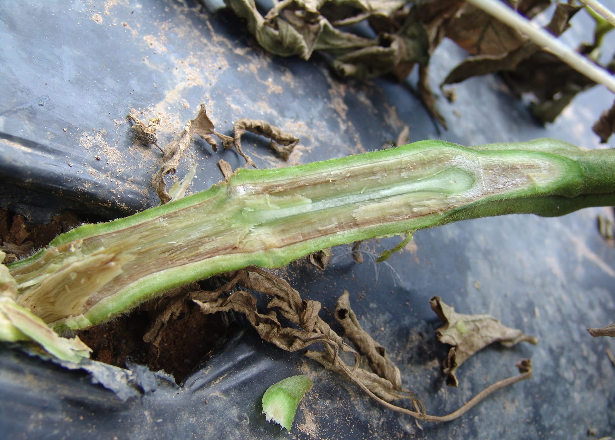 Bệnh héo xanh vi khuẩn (Ralstonia solanacearum) khiến cây đang sinh trưởng xanh tốt, đặc biệt là ở giai đoạn ra hoa, đậu quả, bỗng nhiên có dấu hiệu héo rũ đột ngột vào ban ngày khi trời nắng gắt. Ban đầu, cây có thể phục hồi và xanh lại vào buổi chiều mát hoặc ban đêm, sau đó cây sẽ héo hoàn toàn mà lá vẫn còn xanh, không bị teo tóp hay biến màu ở phần vỏ bên ngoài. Tương tự bệnh héo vàng do Fusarium, khi chẻ dọc thân cây sẽ thấy mạch dẫn bên trong bị hóa nâu. Tuy nhiên, khi dùng tay bóp nhẹ vào thân, có thể thấy dịch nhầy màu trắng đục rỉ ra từ mạch dẫn.