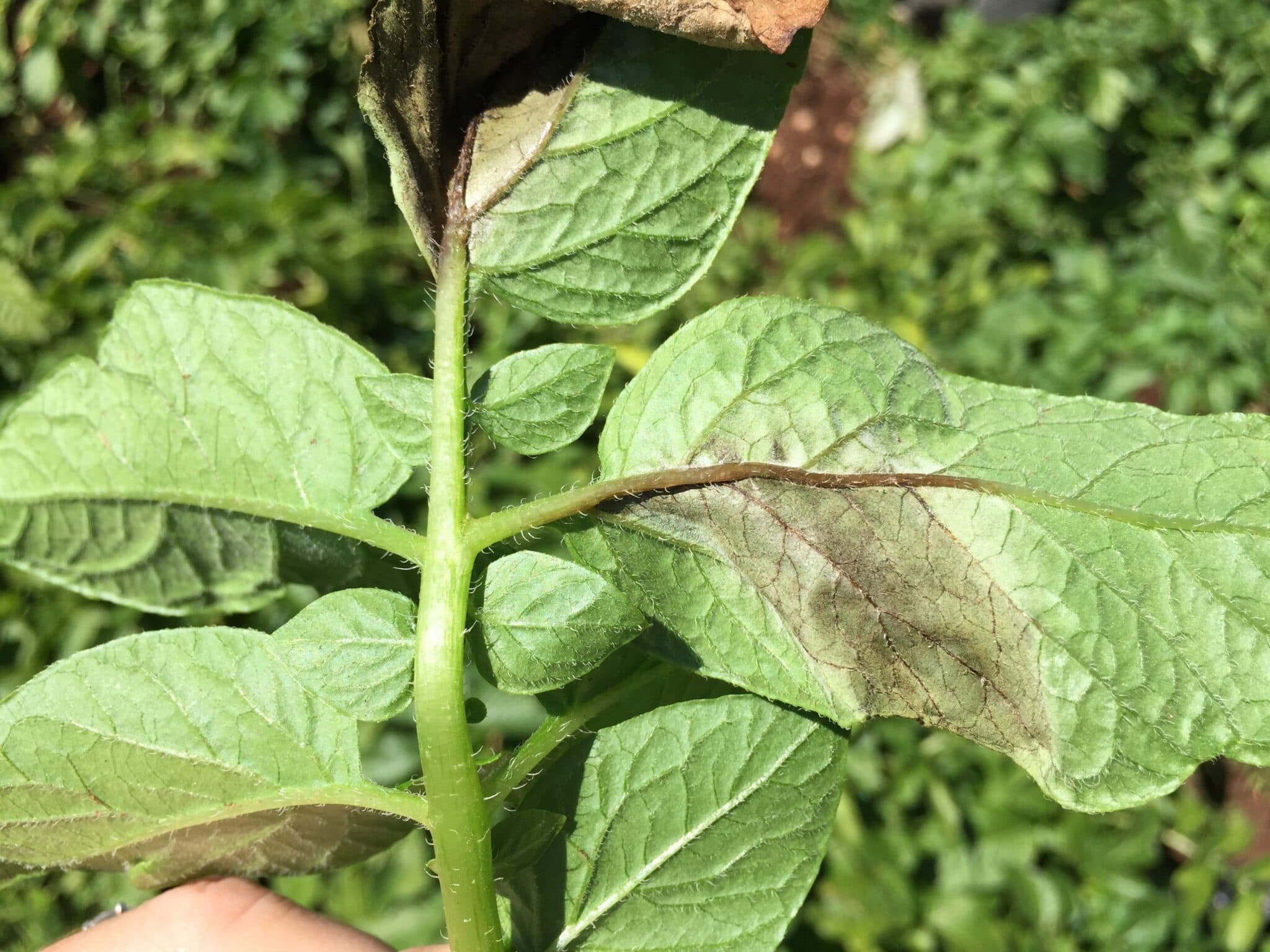 Bệnh mốc sương (Phytophthora infestans) có thể tấn công tất cả các bộ phận trên mặt đất của cây (lá, thân, cành, hoa và quả) ở mọi giai đoạn sinh trưởng. Vết bệnh ban đầu thường xuất hiện ở mép lá hoặc chóp lá, trông như những đốm "úng nước" có màu xanh xám, xanh tối. Ở mặt dưới của lá, tại rìa vết bệnh sẽ xuất hiện một lớp mốc mỏng, màu trắng như sương khi độ ẩm không khí cao. Vết bệnh có màu nâu hoặc đen, hơi lõm vào, lan rộng và kéo dài dọc theo thân, cành. Bệnh tấn công cuống hoa, đài hoa, làm hoa bị thối đen và rụng hàng loạt. Vết bệnh trên quả ban đầu là những đốm nhỏ màu xanh xám, hơi sũng nước, sau đó lan rộng thành những mảng lớn có màu nâu sô-cô-la, bề mặt hơi gồ ghề, cứng.