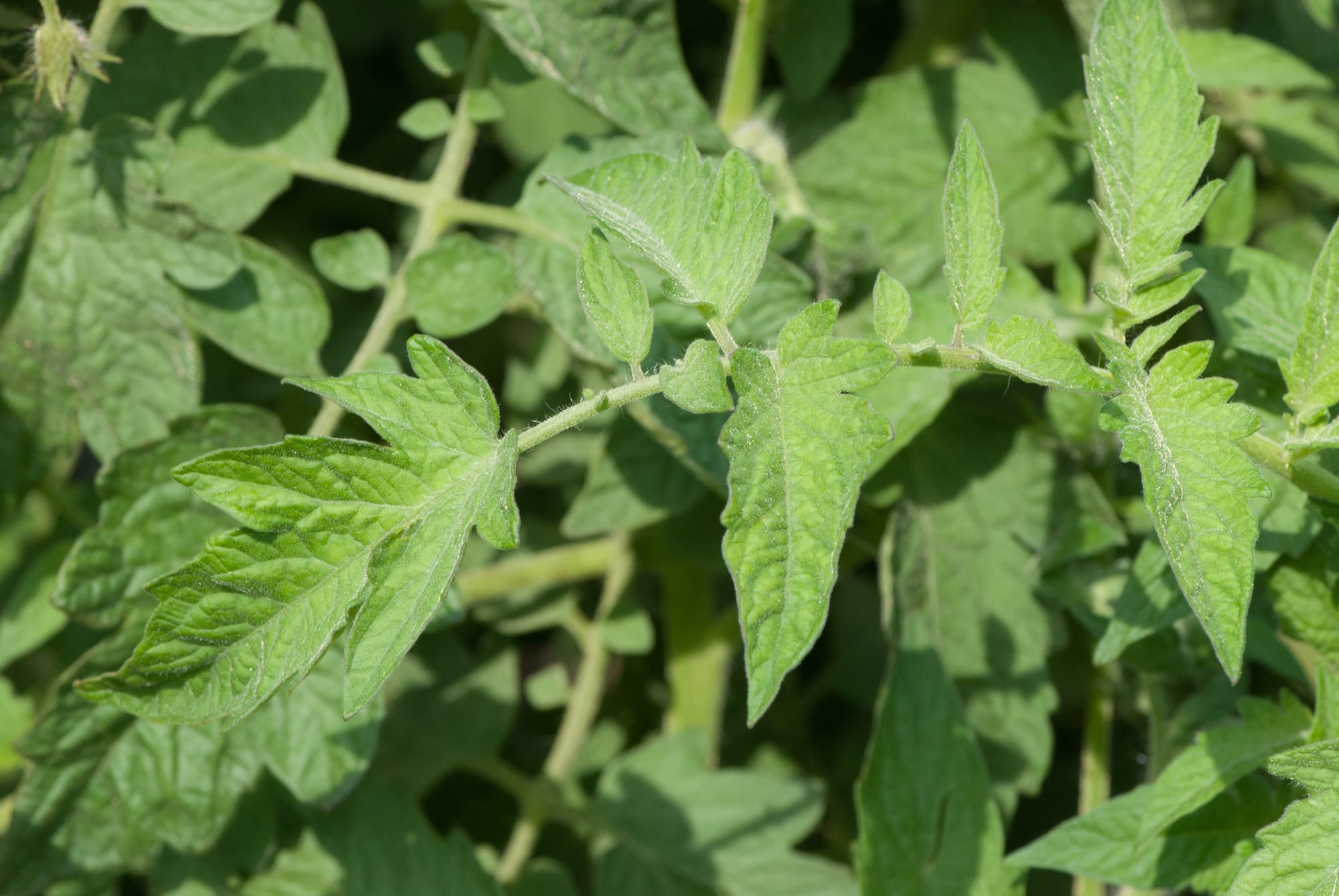Lá: Lá cà chua mọc cách, thuộc dạng lá kép lông chim lẻ, dài từ 10-25 cm. Mỗi lá có từ 5 đến 9 lá chét với mép lá có răng cưa. Lá được bao phủ dày đặc bởi lông tuyến, có mùi thơm nồng đặc trưng.