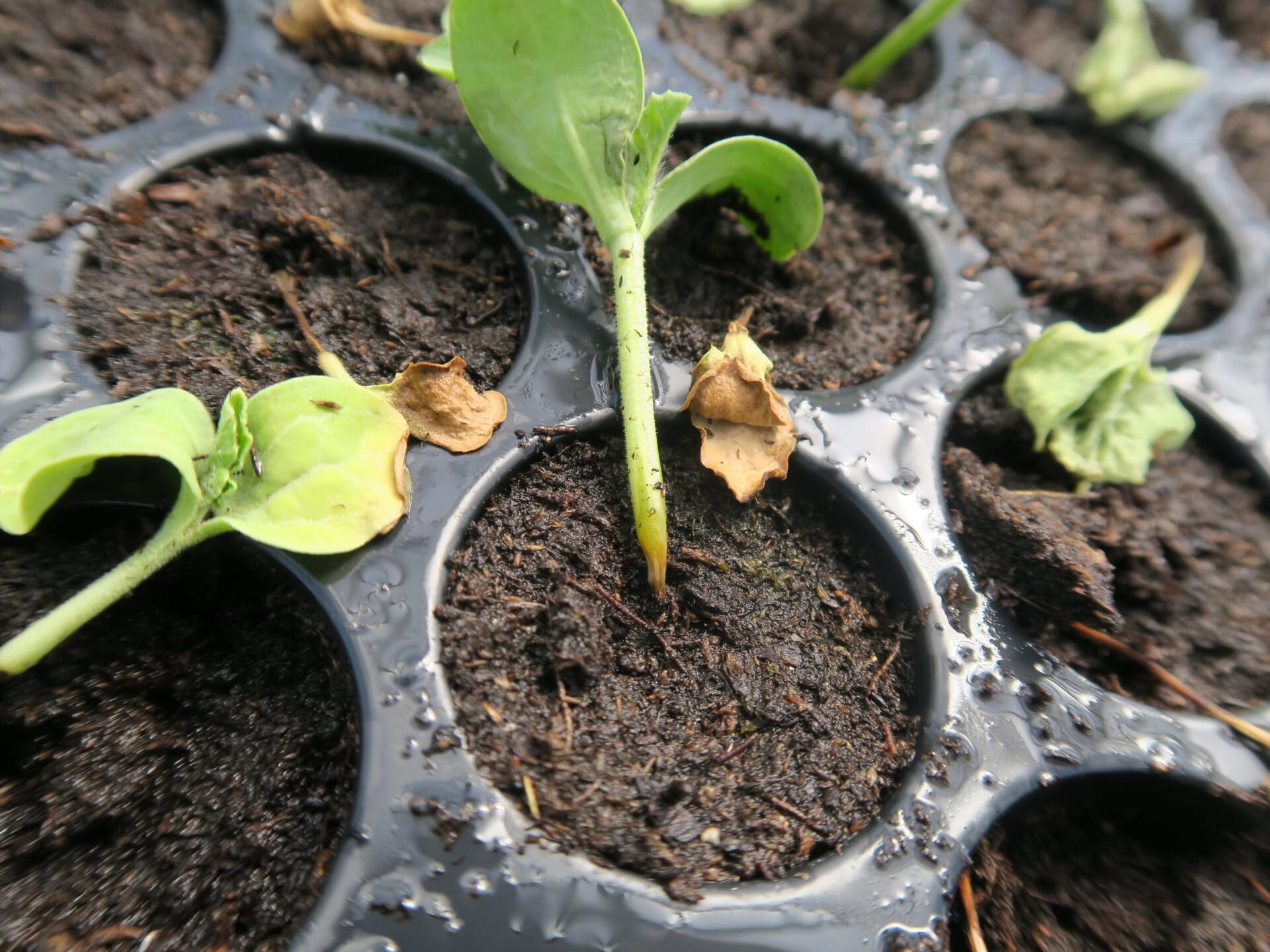 Bệnh chết rạp cây con (Rhizoctonia solani, Fusarium solani, Pythium spp.) thường xuất hiện lúc cây 2 lá mầm đến có lá thật, khi thời tiết nóng, ẩm, tưới quá nhiều, đất làm bầu chặt dí. Cổ rễ xuất hiện một vết bệnh nhỏ, trông như bị úng nước. Vết bệnh nhanh chóng lan rộng, chuyển sang màu nâu hoặc đen, làm cho thân cây bị tóp và teo nhỏ lại. Cây con đột ngột ngã gục xuống trong khi phần lá bên trên vẫn còn xanh tươi. Sau vài ngày, toàn bộ cây sẽ chết khô.