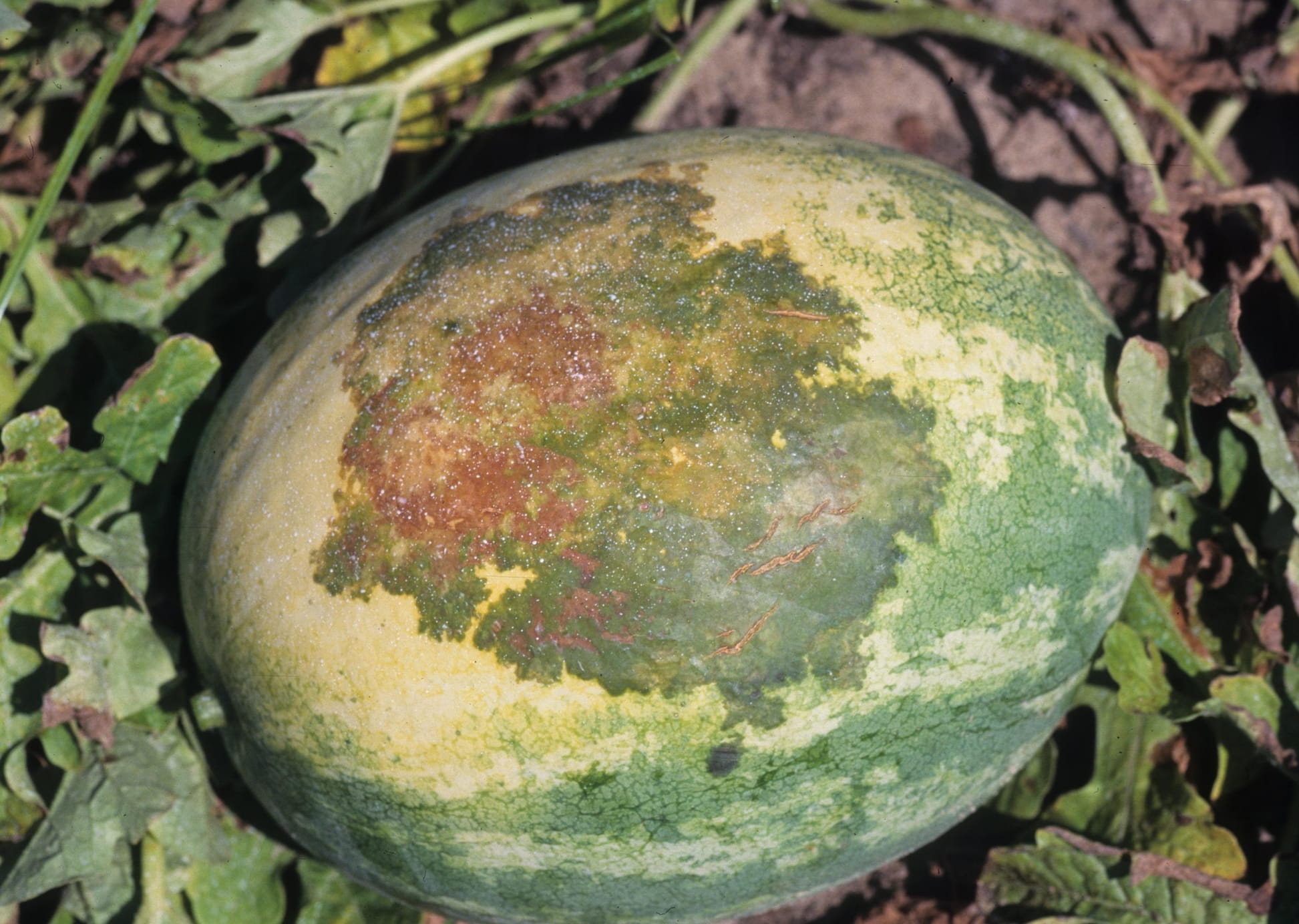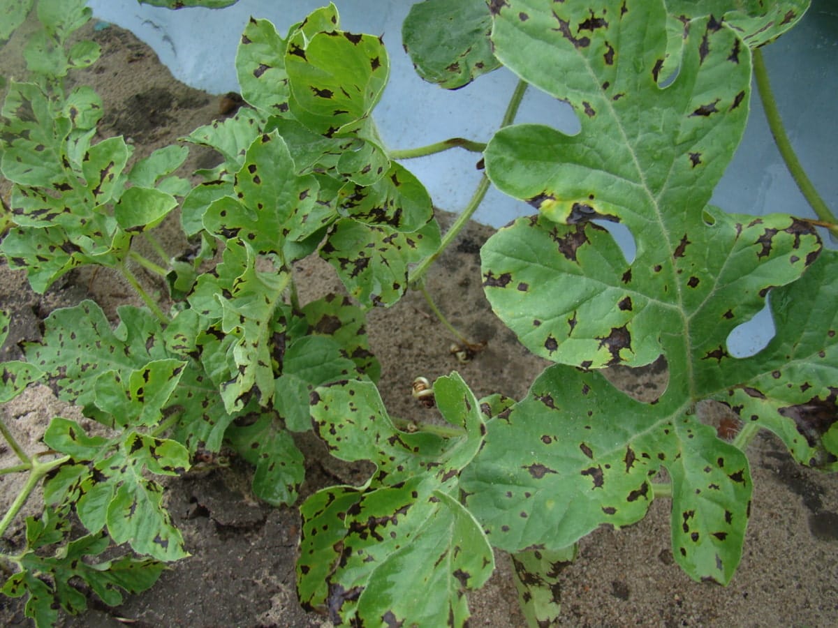Bệnh thán thư (Colletotrichum orbiculare) bùng phát dữ dội khi trời mưa nhiều, độ ẩm không khí cao (>90%). Bệnh có thể tấn công tất cả các bộ phận trên mặt đất của cây (lá, thân, quả). Ban đầu, vết bệnh là những đốm nhỏ, úng nước, màu vàng nhạt. Vết bệnh phát triển nhanh, lõm sâu xuống so với bề mặt, viền đen và tâm màu nâu nhạt. Vết bệnh ăn sâu vào trong ruột quả, gây thối đắng, làm quả mất hoàn toàn giá trị thương phẩm.