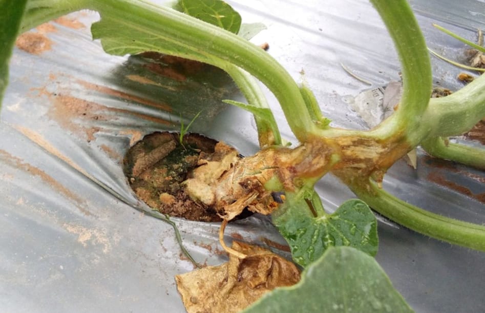Bệnh nứt dây chảy nhựa (Mycosphaerella melonis/Didymella bryoniae) bùng phát mạnh khi độ ẩm không khí trên 85%. Trên thân xuất hiện những đốm hình bầu dục, màu xanh nhạt hoặc trắng xám, trông như bị úng nước, đặc biệt là ở các lóng gần gốc hoặc điểm phân nhánh. Phần vỏ thân tại vị trí bệnh bị nứt ra theo chiều dọc. Từ vết nứt, một dòng nhựa ứa ra. Bên trong vết bệnh, nếu độ ẩm cao, có thể thấy các chấm đen li ti, đó là quả thể của nấm. Khi bệnh bao quanh thân, nó sẽ làm tắc nghẽn mạch dẫn, khiến phần ngọn phía trên bị héo và chết. Vết bệnh trên quả ban đầu là đốm tròn, lõm vào, úng nước, sau đó lớn dần, chuyển sang màu nâu đen và thối nhũn.