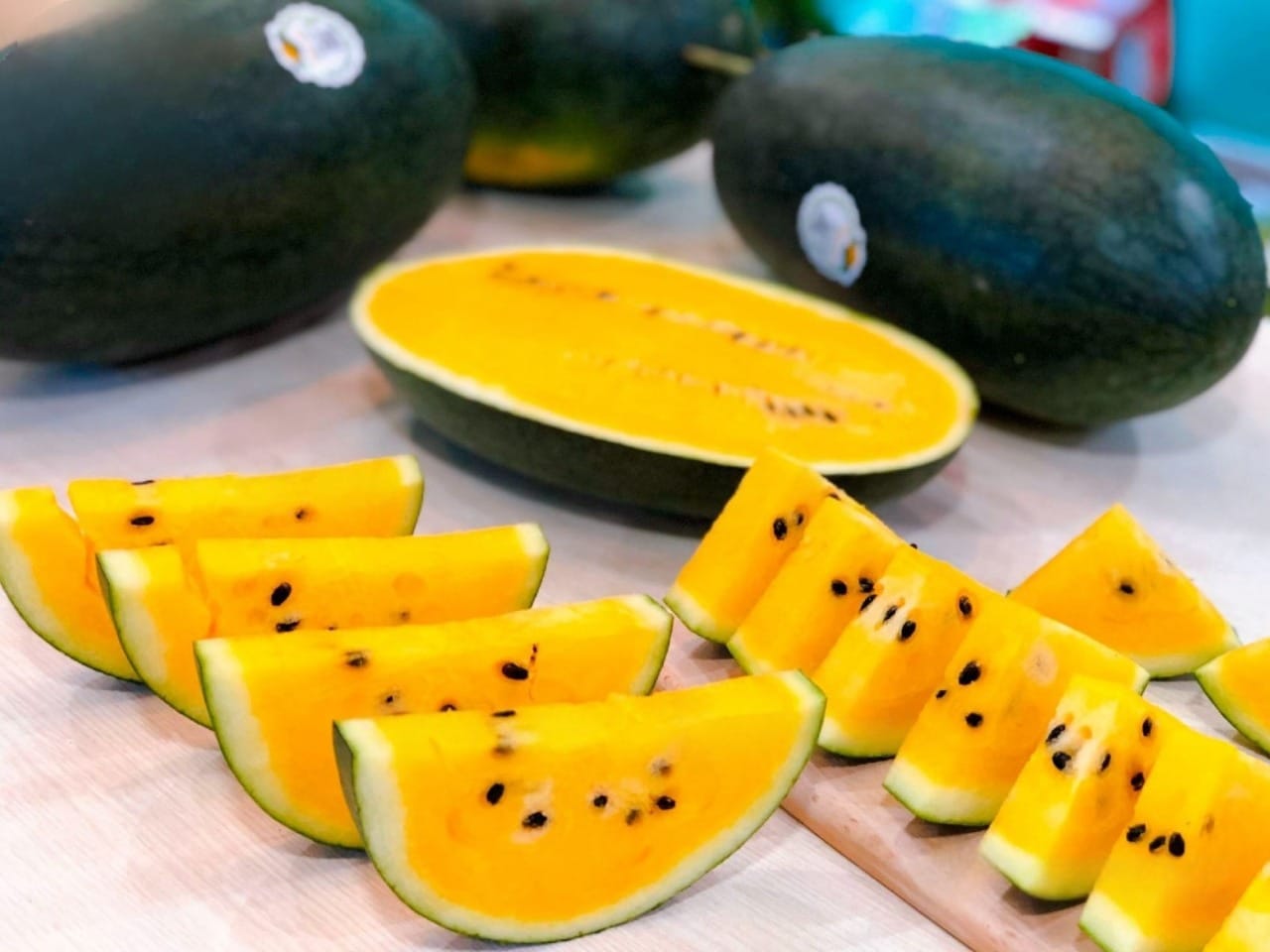 Kim Hồng: là giống F1. Quả có dạng oval, đồng đều, trọng lượng trung bình mỗi quả nặng 2,5-4 kg. Điểm độc đáo và tạo nên tên tuổi của giống dưa này là vỏ quả khi chín có màu vàng kim rực rỡ, trơn bóng và rất đẹp mắt. Vỏ mỏng nhưng dai và chắc chắn, giúp quả dễ dàng vận chuyển đi xa mà ít bị dập nát. Ruột quả có màu đỏ đậm, tươi tắn, thịt quả chắc, giòn, mọng nước và có vị ngọt đậm. Đây là giống ngắn ngày, thời gian từ khi gieo đến khi thu hoạch chỉ khoảng 60-65 ngày. Cây sinh trưởng rất khỏe, có khả năng thích nghi rộng với nhiều điều kiện khí hậu và đất đai khác nhau. Sự tương phản này không chỉ tạo ra một sản phẩm lạ mắt mà còn mang nhiều ý nghĩa về mặt phong thủy (màu vàng tượng trưng cho tài lộc, màu đỏ cho sự may mắn), vì vậy dưa Kim Hồng cực kỳ được ưa chuộng làm quà biếu hoặc chưng bày trong các dịp Lễ, Tết.