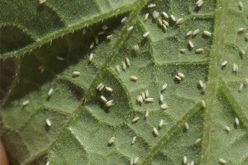 Bọ phấn trắng (Bemisia tabaci) được bao phủ bởi một lớp bột sáp màu trắng, giống như phấn. Sâu non màu vàng nhạt, bám chặt vào mặt dưới lá. Cả con trưởng thành và ấu trùng đều dùng miệng chích vào các bộ phận non của cây (chủ yếu là lá) để hút nhựa. Khi bị chích hút với mật độ cao, cây sẽ mất dinh dưỡng, dẫn đến sinh trưởng kém, còi cọc, lá bị vàng, xoăn lại và có thể rụng sớm. Bọ phấn trắng tiết ra dịch ngọt là môi trường cho nấm muội đen phát triển và truyền các bệnh virus gây bệnh cho cây.