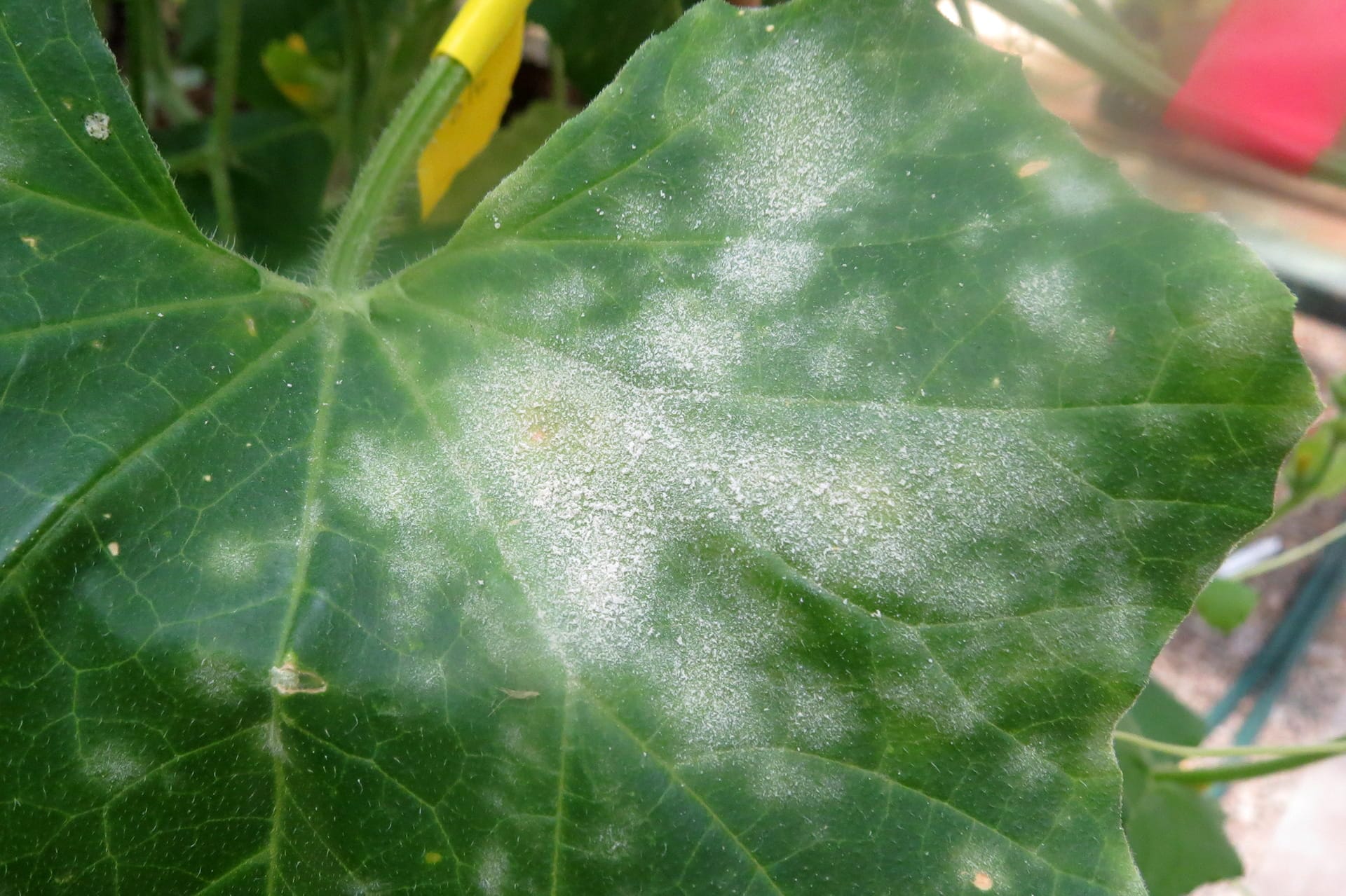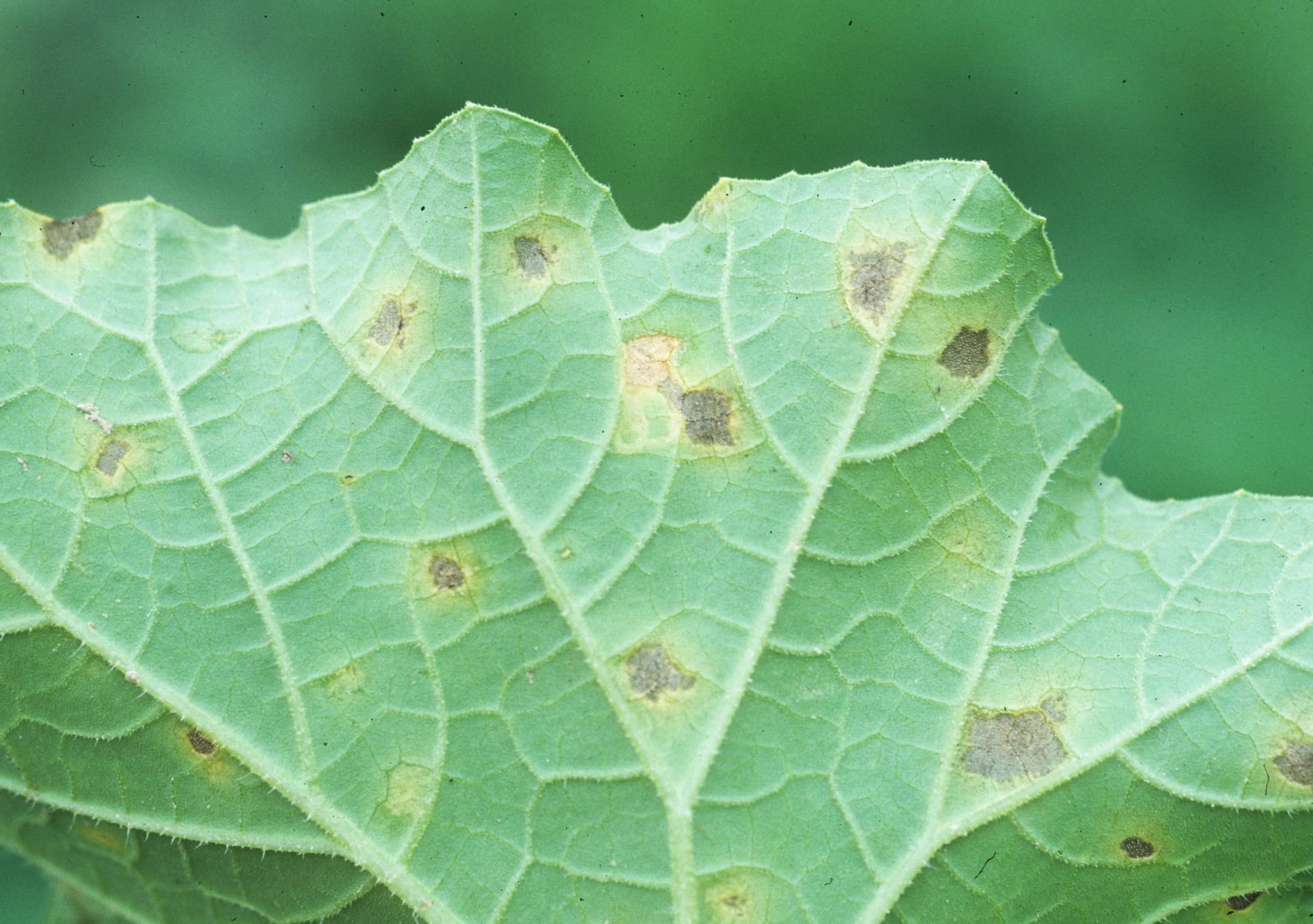 Bệnh giả sương mai (Pseudoperonospora cubensis) rất dễ bị nhầm lẫn với bệnh phấn trắng ở giai đoạn đầu. Dấu hiệu ban đầu là những đốm nhỏ, màu xanh nhạt hoặc vàng nhạt, có hình đa giác (góc cạnh) do bị giới hạn bởi các gân lá. Mặt dưới lá sẽ hình thành một lớp mốc màu xám đến tím nhạt, thường xuất hiện rõ nhất vào buổi sáng sớm khi trời còn ẩm ướt, có sương. Bệnh thường gây hại từ lá gốc phát sinh dần lên phía trên.