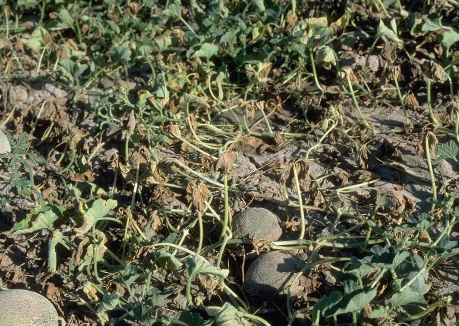 Bệnh héo rũ (chạy dây, Fusarium oxysporum f. sp. melonis) có thể biểu hiện triệu chứng ở bất kỳ giai đoạn nào, nhưng thường rõ nhất từ khi cây bắt đầu ra hoa, đậu quả. Dấu hiệu đầu tiên là một hoặc vài dây (nhánh) trên cây đột ngột héo rũ vào giữa trưa nắng, sau đó có thể phục hồi lại vào buổi chiều mát hoặc sáng sớm. Hiện tượng này lặp lại trong vài ngày. Lá trên dây bị héo có thể chuyển sang màu xanh xám hoặc vàng nhạt. Sau vài ngày, hiện tượng héo không còn phục hồi được nữa. Toàn bộ cây hoặc các nhánh bị bệnh sẽ héo rũ hoàn toàn và chết khô.
