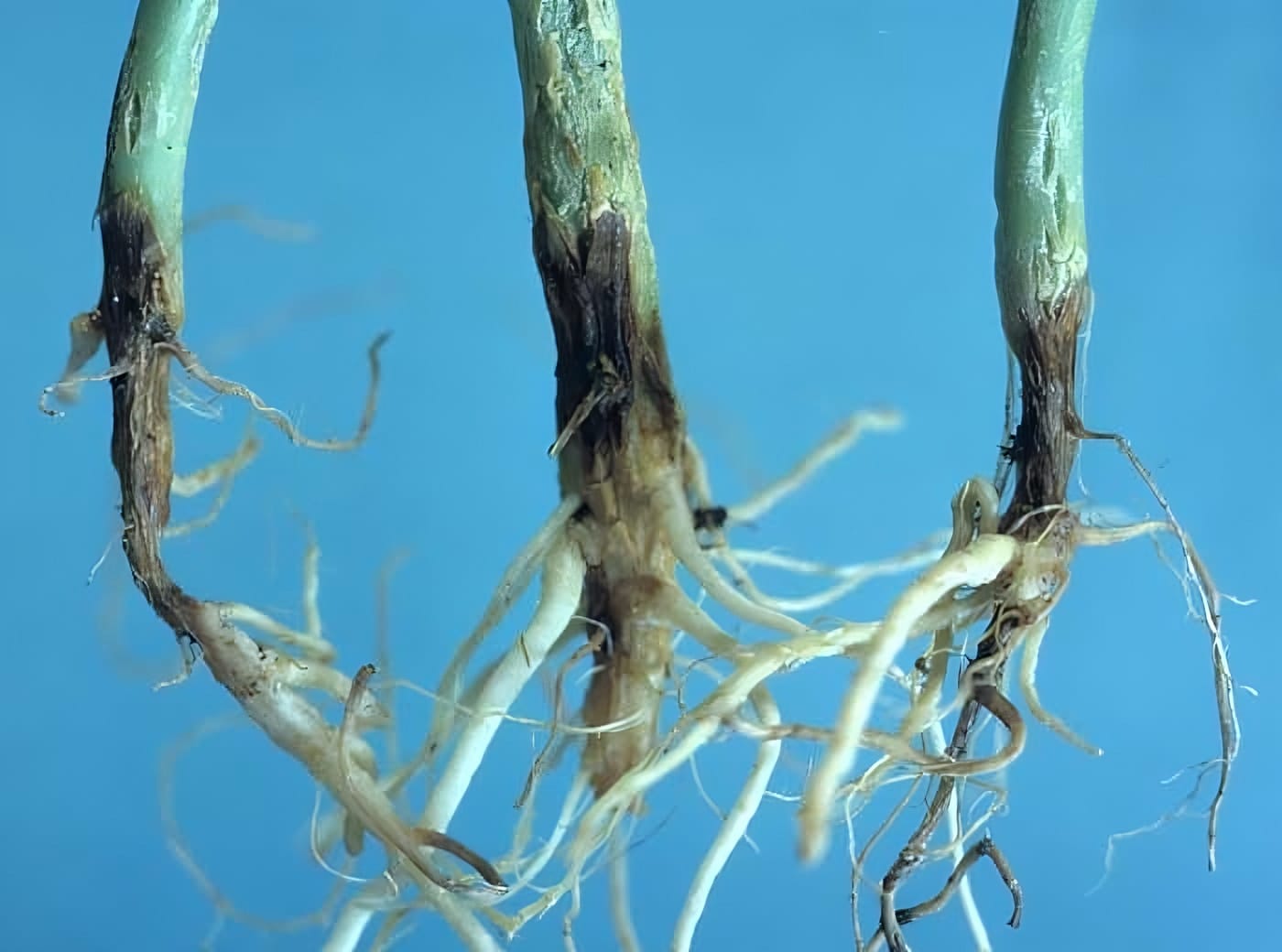 Bệnh lở cổ rễ (Rhizoctonia solani, Fusarium solani, Pythium spp.) gây hại ở phần cổ rễ, phần gốc sát mặt đất. Vết bệnh có màu khác với vỏ cây, phần vỏ này bị rộp lên, sau đó lan dần bao quanh toàn bộ phần cổ rễ hoặc gốc cây. Dần dần phần vỏ này khô teo lại, khi gặp trời mưa hoặc độ ẩm cao sẽ bị thối nhũn, bong ra, trơ lại phần lõi gỗ của cây có màu thâm đen, cây sẽ héo dần và chết.