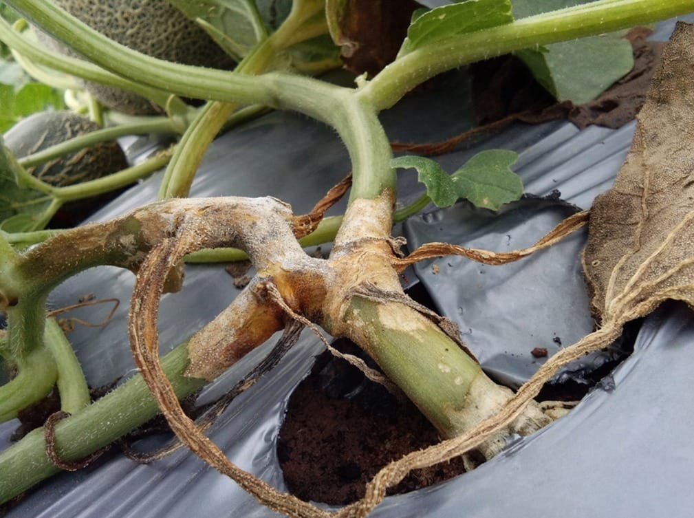 Bệnh nứt dây chảy nhựa (Mycosphaerella melonis/Didymella bryoniae) gây hại chủ yếu trên thân, đôi khi trên lá và cuống quả. Ban đầu, đó là những đốm úng nước, có màu xanh tối. Vết bệnh sau đó lớn dần, chuyển sang màu nâu xám hoặc trắng xám. Dấu hiệu điển hình nhất là thân cây tại vị trí bệnh bị nứt ra và ứa ra những giọt nhựa màu hổ phách hoặc nâu đỏ. Khi khô lại, các giọt nhựa này cứng lại. Bên trong vết bệnh, nếu độ ẩm cao, có thể thấy các chấm đen li ti, đó là quả thể của nấm. Khi bệnh bao quanh thân, nó sẽ làm tắc nghẽn mạch dẫn, khiến phần ngọn phía trên bị héo và chết. Vết bệnh trên quả ban đầu là đốm tròn, lõm vào, úng nước, sau đó lớn dần, chuyển sang màu nâu đen và thối nhũn.