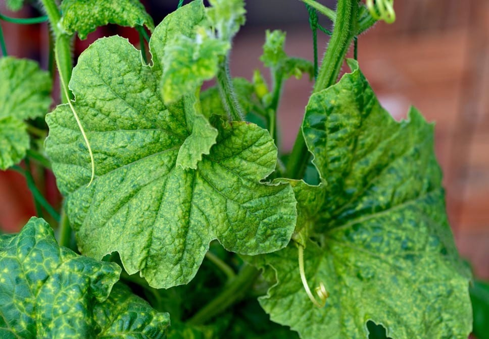 Bệnh như khảm lá (CMV) và xoăn lá (SLCV) có thể gây hại trên nhiều loại cây trồng rau màu khác nhau. Trên lá xuất hiện những mảng màu loang lổ giữa xanh đậm và vàng nhạt xen kẽ nhau, tạo thành hình dạng lốm đốm như tranh khảm. Lá cây bị nhăn nheo, kích thước nhỏ hơn bình thường, mép lá có thể bị cong xuống hoặc bị xoăn tít, co rúm lại, biến dạng nghiêm trọng. Cây bị bệnh sinh trưởng rất kém, các đốt thân ngắn lại, cây bị lùn, kém phát triển so với cây khỏe. Nếu cây bị nhiễm bệnh từ giai đoạn sớm, cây sẽ không thể ra hoa và đậu quả, gây thất thu hoàn toàn.