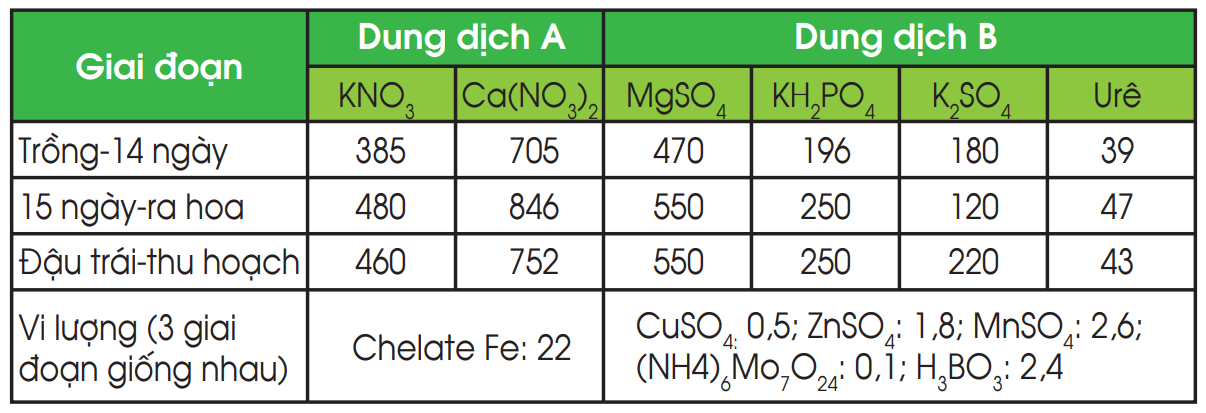 dung dịch dinh dưỡng, có thể mỗi lần thực hiện với lượng đủ cung cấp cho cây trong thời gian 3-5 ngày. Lưu ý tránh pha chung các muối có gốc phosphate (PO43–) và gốc canxi (Ca2+), gốc sắt (Fe2+) sẽ gây kết tủa. Vì vậy nên pha thành 2 loại dung dịch dinh dưỡng A, B riêng biệt.
