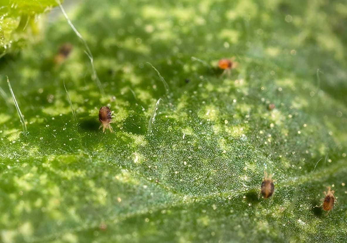 Nhện đỏ (Tetranychus urticae) có kích thước rất nhỏ, khó nhìn thấy bằng mắt thường, cơ thể có hình bầu dục, màu vàng nhạt, xanh lá cây hoặc phổ biến nhất là màu đỏ cam. Chúng có 8 chân, khác với côn trùng chỉ có 6 chân. Chúng sống và gây hại chủ yếu ở mặt dưới của lá, đặc biệt là các lá đã trưởng thành, lá bánh tẻ và lá già, dùng miệng chích vào tế bào của lá để hút dịch. Trên mặt trên của lá xuất hiện những chấm nhỏ li ti màu trắng hoặc vàng nhạt. Khi quan sát kỹ ở mặt dưới lá, có thể thấy một lớp màng tơ mỏng do nhện giăng ra.