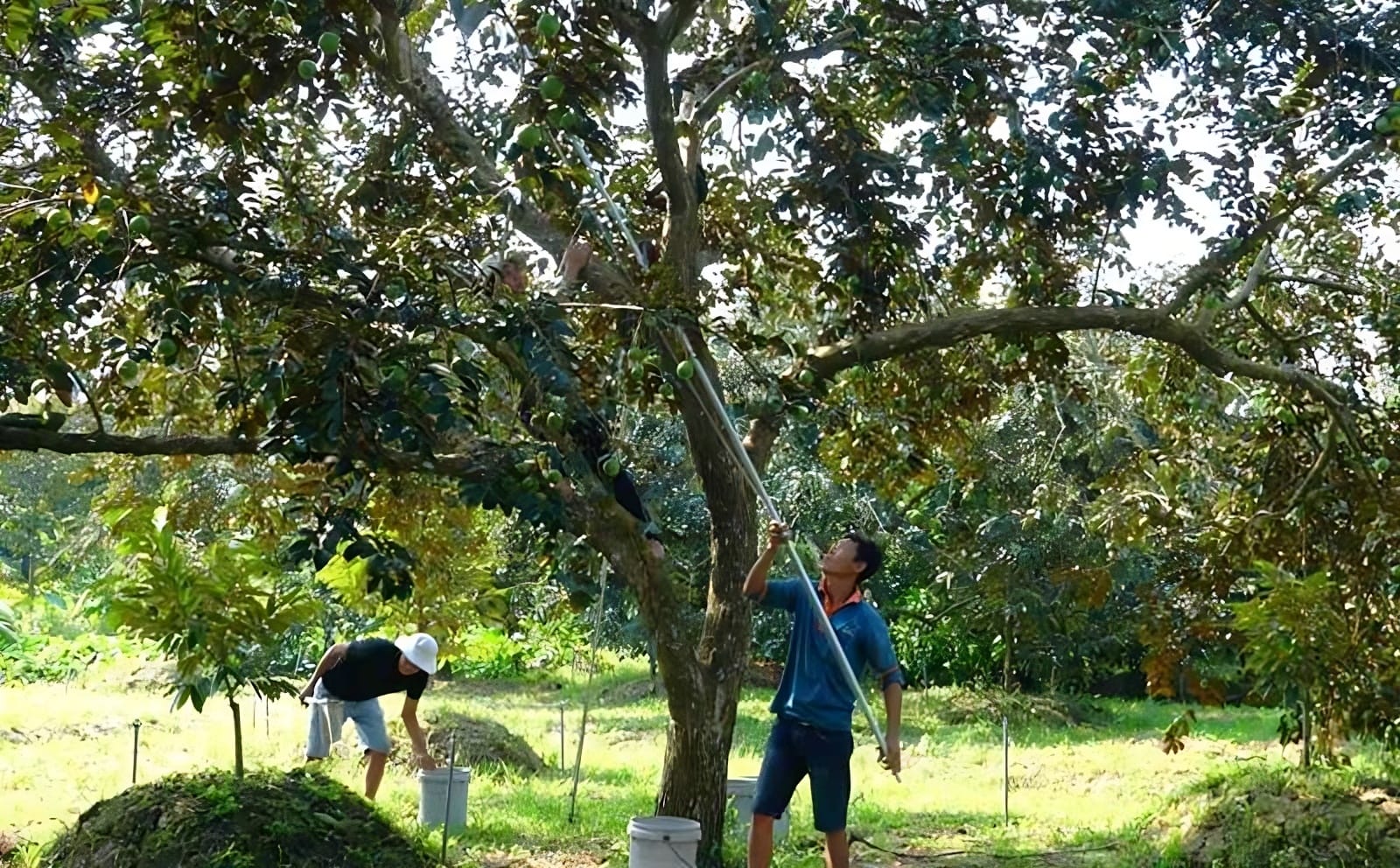 Phương pháp thu hoạch: Sử dụng kéo sắc để cắt cuống quả hoặc dùng các loại vợt hái quả chuyên dụng có túi hứng, tránh làm quả rơi hoặc va đập.Thao tác phải nhẹ nhàng để không làm dập vỏ, trầy xước hay làm rụng cuống, vì đây là những điểm xâm nhập chính của vi sinh vật gây thối hỏng. Quả sau khi hái không được để trực tiếp xuống đất. Cần lót các vật liệu mềm như giấy, lá khô hoặc xốp vào trong giỏ, sọt hoặc thùng chứa để tránh va chạm trong quá trình vận chuyển từ vườn về nhà đóng gói.
