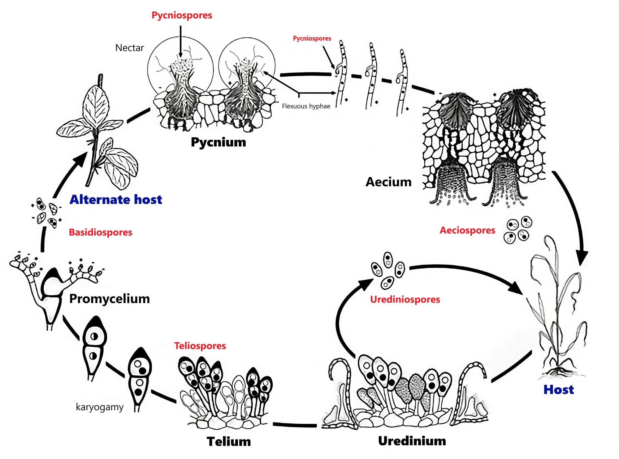 Teleomorph, anamorph, pycniospores, aeciospores, urediniospores, teliospores, basidiospores, Puccinia, Uromyces, Hemileia, Gymnosporangium, Phakopsora, Coleosporium