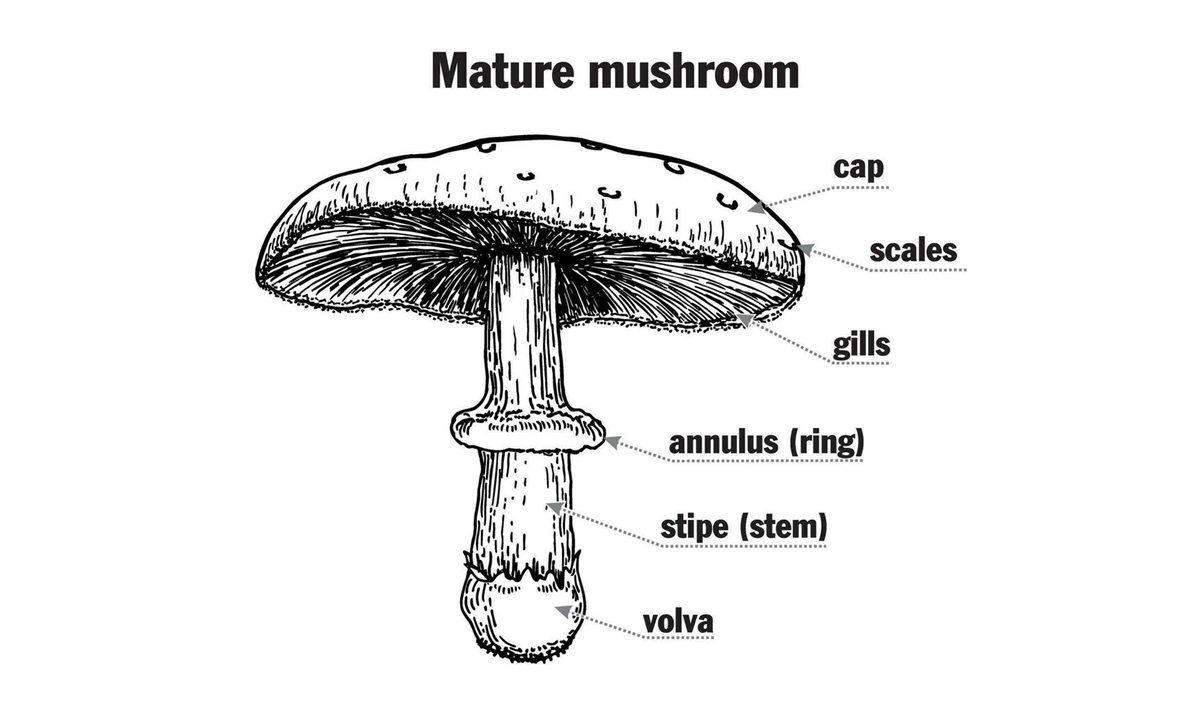 - Giai đoạn Hình nút (Tiny button stage): Quả thể có dạng hình cầu nhỏ, được bao bọc hoàn toàn bởi lớp màng bao trắng.