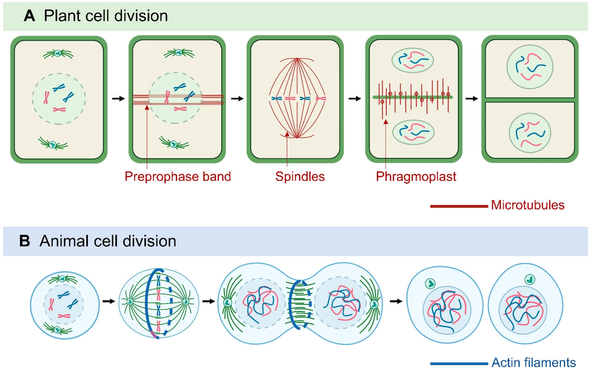 Sự phân chia tế bào chất ở thực vật có một khác biệt cơ bản so với tế bào động vật, xuất phát từ một ràng buộc vật lý cơ bản: sự tồn tại của thành tế bào (cell wall) cứng nhắc. Do có thành tế bào, tế bào thực vật không thể phân chia bằng cách hình thành eo thắt (cleavage furrow) để co rút màng tế bào lại như ở tế bào động vật. Thay vào đó, tế bào thực vật phải xây dựng một bức tường mới từ bên trong. Cơ chế này được điều khiển bởi một cấu trúc vi ống (microtubule) phức tạp và độc đáo gọi là thể dải phân (phragmoplast). Sự định hướng của mặt phẳng phân chia (được quyết định bởi vị trí hình thành phragmoplast) là một sự kiện hình thái học (morphogenetic) then chốt. Sự phân chia đối xứng hay không đối xứng, và theo mặt phẳng nào (ngang, dọc, hay tiếp tuyến) sẽ quyết định trực tiếp đến hình dạng của mô và cơ quan (ví dụ: tạo ra một chuỗi tế bào, một lớp biểu bì, hay một khối mô đặc).