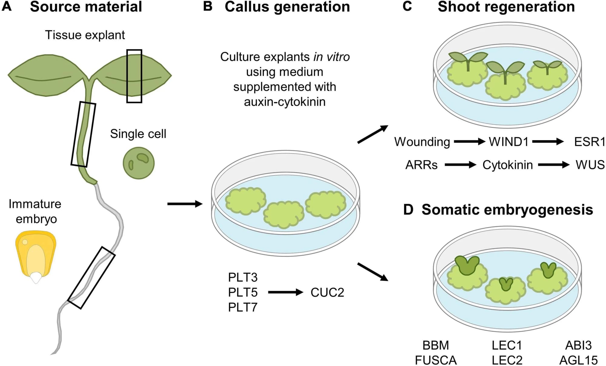 Khả năng này tồn tại được là nhờ mỗi tế bào (ngay cả tế bào chuyên hóa như tế bào lá) đều chứa toàn bộ bộ gen cần thiết để mã hóa cho tất cả các bộ phận của cây. Khi gặp điều kiện thích hợp, tế bào đã biệt hóa có thể quên chức năng cũ, quay trở lại trạng thái ban đầu (như tế bào phôi) và bắt đầu phân chia tạo ra mô sẹo (callus). Từ mô sẹo, bằng cách điều chỉnh nồng độ hormone, các tế bào này có thể được lập trình lại để phát triển thành chồi, rễ, và cuối cùng là cây con hoàn chỉnh.